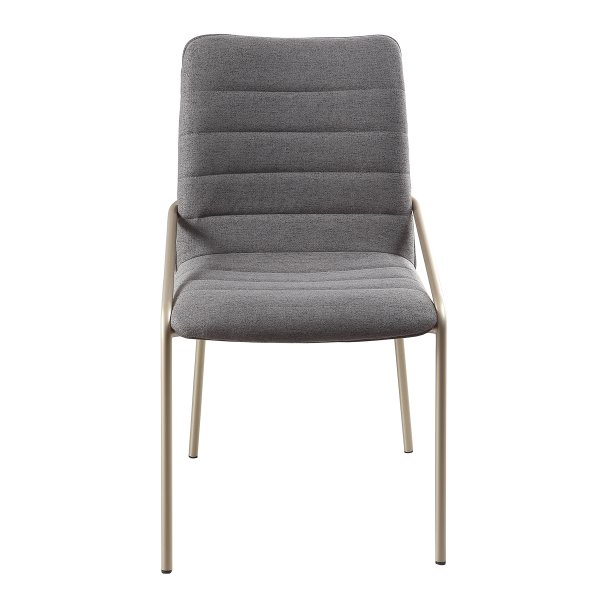 Sua estrutura é fabricada em aço carbono de alta resistência, com acabamento em pintura automotiva na cor champanhe — uma tonalidade refinada que valoriza a decoração com discrição e charme. O assento e encosto são estofados em linho chumbo, um tecido de textura agradável, durável e de fácil manutenção.