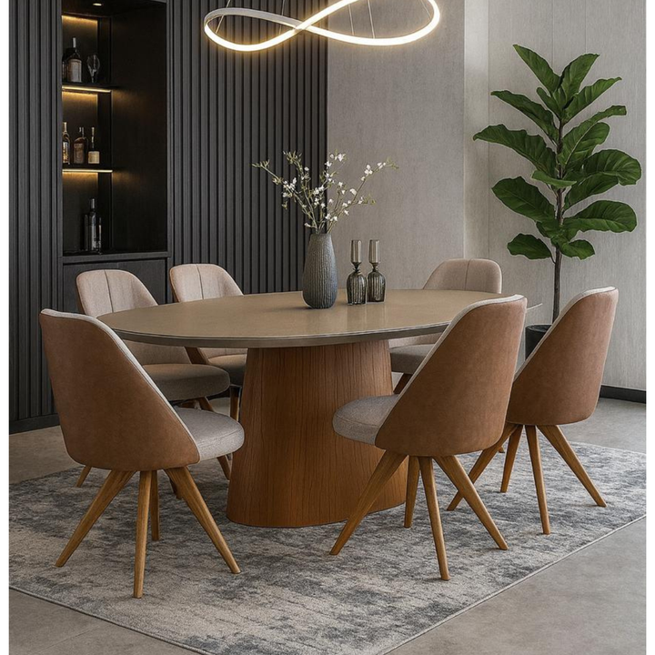 Transforme sua sala de jantar com um conjunto que une sofisticação, conforto e funcionalidade. A mesa New York com tampo oval de 220 cm é perfeita para reunir amigos e família, enquanto as cadeiras Malu oferecem um toque de elegância com sua base giratória e mix de tecidos modernos.