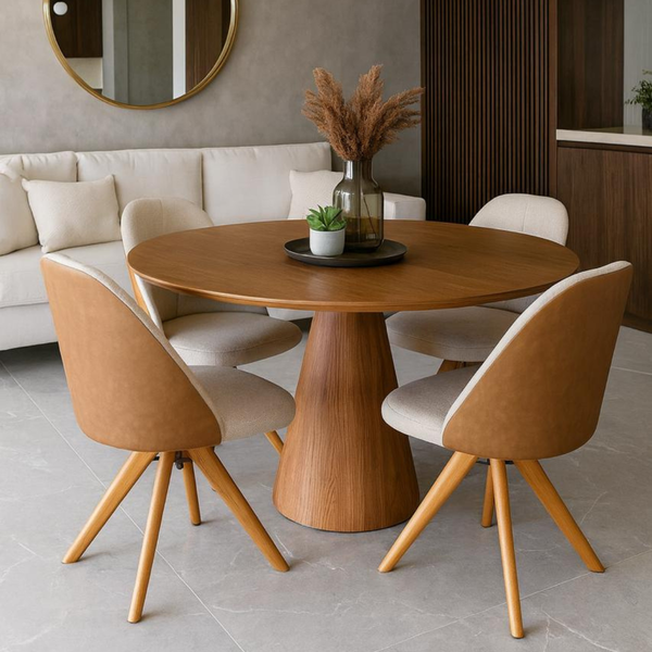 Ideal para ambientes compactos que não abrem mão da elegância, o conjunto New York com 4 cadeiras Malu entrega estilo, conforto e funcionalidade. A mesa redonda de 120 cm em madeira mel harmoniza perfeitamente com as cadeiras giratórias que combinam tecidos e texturas modernas.