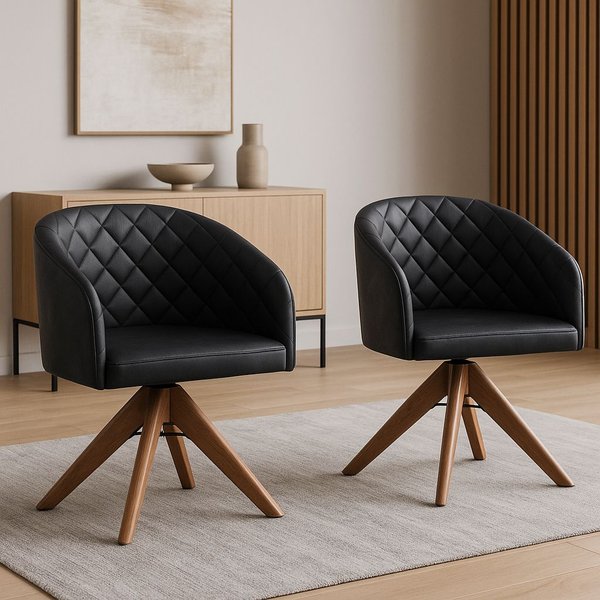 Com estrutura em madeira maciça na cor castanho e base giratória, as poltronas permitem maior mobilidade e praticidade no uso diário. Nesta versão, o revestimento em courino Durango preto com acabamento em matelassê garante um visual sofisticado e imponente, valorizando ambientes como salas de estar, home office ou recepções.