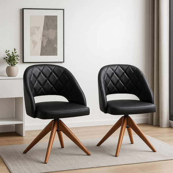 A estrutura é feita em madeira maciça com acabamento na cor castanho, e conta com base giratória que proporciona praticidade no dia a dia. O modelo está disponível em dois revestimentos premium: o clássico e elegante courino Durango preto, e o leve e acolhedor linho palha.