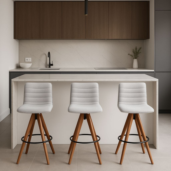 O Kit com 3 Banquetas Lucy da Exclusiva é ideal para compor ambientes modernos com elegância, praticidade e personalidade. Com base giratória e estrutura em madeira maciça na cor castanho, cada banqueta entrega durabilidade e mobilidade no uso diário.