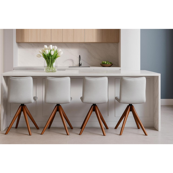 Cada cadeira conta com estrutura giratória em madeira maciça na cor castanho, proporcionando resistência e sofisticação. O revestimento em linho alumínio confere leveza visual e versatilidade para compor com diferentes estilos de decoração.